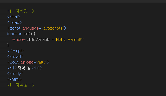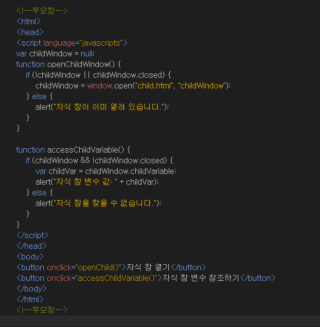 2. 부모창의 accessChildVariable 함수를 통해 자식 창에서 선언된 childVariable 변수에 접근